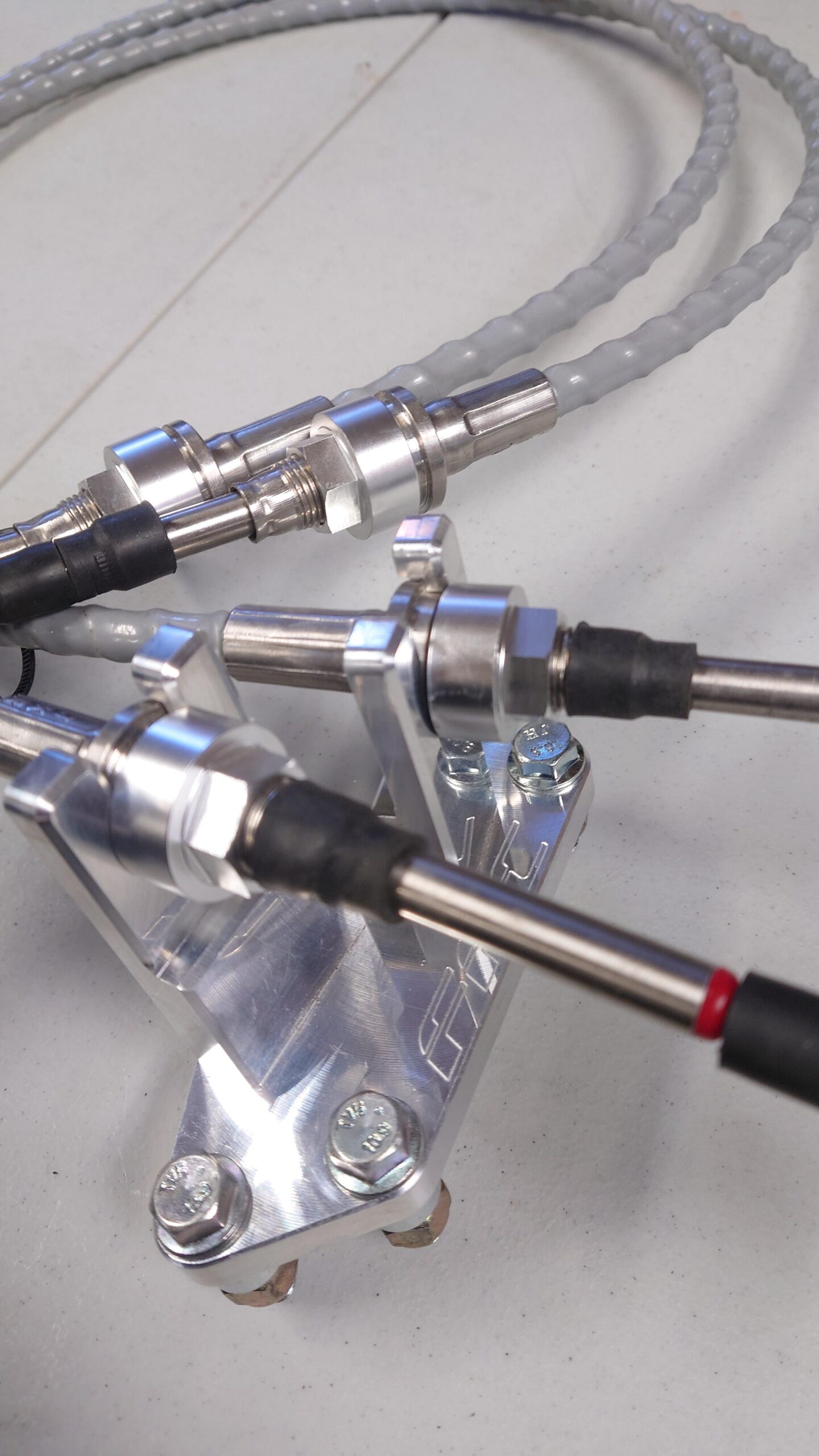 Our Race-Spec-Shifter Cables are made almost entirely of stainless steel, including the very important inner cable and all of the exposed cable guides. The outer cable is constructed with a low friction Teflon coated inner liner and polyethylene outer covering – same as the other cables available. Even the cable mounting ends are made from stainless steel and were designed with a threaded section to eliminate the need for the OEM cable clips. However, the OEM clips can still be used if desired. The rod end connections are fully adjustable and made from 6061 billet aluminum at all four ends. There is a billet rod end at the gear selector, but it has an added spherical Delrin insert to allow proper movement at this joint. Allowing this movement helps reduce possible cable bind during shifting.