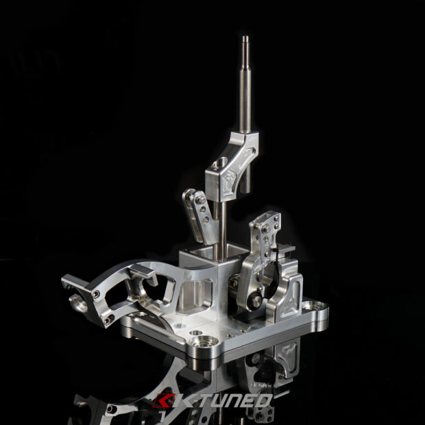 The K-Tuned Billet RSX Shifter is a direct replacement for the OEM 2002-2006 RSX-S shifter box and was been designed to work with both factory and aftermarket shifter cables. The full billet design is extremely strong and eliminates all the flex and looseness that are felt with the stock plastic box. The shift lever and pivot ball are made from solid stainless steel and are seated in a spring loaded brass socket. This combination of stainless and brass allows the two materials to lap together while the springs push up and eliminate play at the ball. For mounting, there are two different sets of holes on the base, so it can be easily bolted into several stock and K-swap applications.