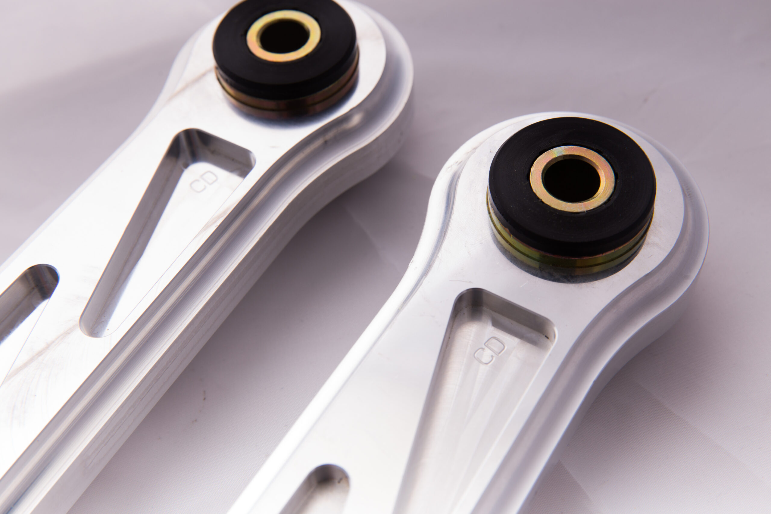 The perfect match to our billet aluminum lower control arms.  We designed our billet aluminum tow arms to complete the package.  We are the only company that offers both lower control arms in billet aluminum.  They are milled just like our lower control arms from a solid piece of 6061 aluminum and feature our standard triangle cuts with our FFC logo etched in the middle.  The installed bushings are Prothane and come with bushing grease.